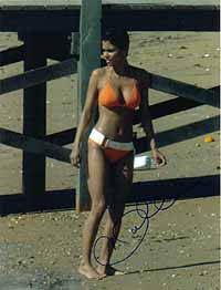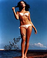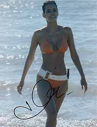 | #4900 Halle Berry US $ 99.00 Brandnew 8x10 color shot from Halle Berry in the brandnew 007 adventure. Have a look at the bikini! Very similar to the one from ursula andress in Dr.No, even with the knife on the side. She is a very tough signer and very very hard to get. Obtained directly from a guy at the studios who got some of her signed at the end of filming. Take the chance. |