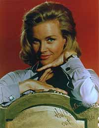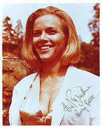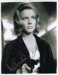 | #1418 Honor Blackman US $ 69.00 8x10 color shot as PUSSY GALORE in Goldfinger. Obtained directly from Mrs. Blackman London/GB/April 1999. Signed in gold paint pen! Great stuff! |