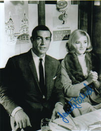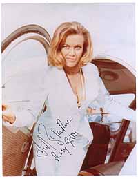 | #4172 Jaqueline Bisset US $ 79.00 8x10 color shot as MISS GOODTHIGHTS in the 007 movie CASINO ROYALE. She is extremely rare to get on a Bond shot and even more with this nice signature and the "Miss Goodthights" addition in her own hand. Obtained directly from her by B'BC president Alexander G. Brauchle. |