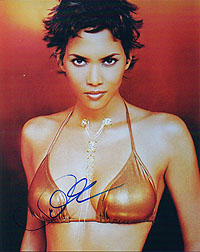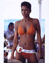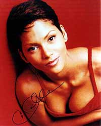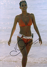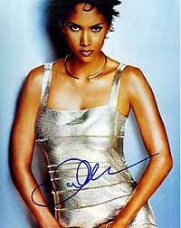 for the Oscar-Winning! Superb 8x10 color photograph from Halle Berry, the brandnew Bond girl in the Bond 20 adventure DIE ANOTHER DAY, which will be released in November 2002. She always was an incredible tough and bad signer (trough the mail she only sends preprints since the beginning of her carreer), and in-person also nearly impossible to get. She is in the same signer league as Sean Connery....But what will happen now???? Now she won the Oscar!!! So it will be more and more impossible to get her AUTHENTIC autograph. Take this rare chance. My world's best star-chaser had the possibility to get her now ONLY ONE ONLY ON ONE PIECE on March 26, 2002 at British Airways (Flight #282) at Lax Airport in Los Angeles. A very rare chance for her autograph. |