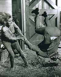 | #4536 Honor Blackman US $ 69.00 Awsome 8x10 color shot as PUSSY GALORE in Goldfinger. The famous haystack scene. Signed by her in gold. Very nice. She stopped signing recently!!! |