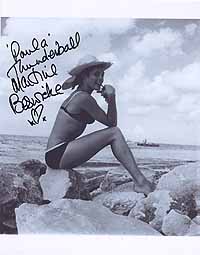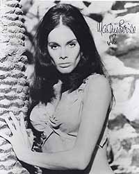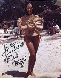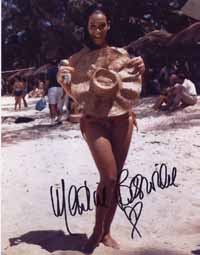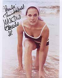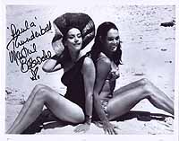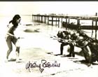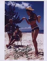 | #1772 Martine Beswicke US $ 79.00 Wonderful 8x10 color shot as "Paula" in THUNDERBALL. She also played "Zora" in FROM RUSSIA WITH LOVE. Very rare color shot. She is pictured with James Bond and Felix Leiter. Wonderfully boldly signed by Martine in black. From US Top Source. |