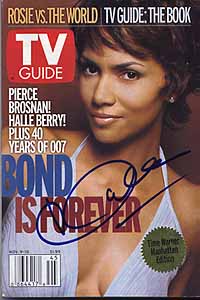 | #5353 Halle Berry US $ 199.00 Fantastic item! Original US TV Guide November 9-15 Time Warner Manhatten edition with 288 pages, signed in-person by Halle Berry aka Jinx in Die Another Day while promoting the new James Bond adventure in New York City during November 2002. A one of a kind piece!!! They produced 2 different title pages. This is the one with Halle Berry on it. RAREST!!!! |