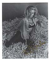 | #2587 Honor Blackman US $ 69.00 8x10 bw sexy shot as PUSSY GALORE in Goldfinger. Wonderfully very sexy shot laying in haystack with open blouse. BOLDLY (very rare!) signed in gold!!!! Wonderful Goldfinger item especially with this bold gold signature. Obtained from a ver reputable auction house in Germany. |