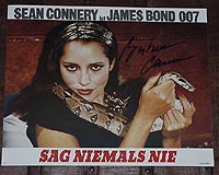 | #3107 Barbara Carrera US $ 79.00 11x15 color original lobby card from NEVER SAY NEVER AGAIN, signed by Barbara Carrera. Awsome photograph!!!! We obtained a complete signed James Bond Lobby Card Collection from a german private collector, this is on piece of this collection! |