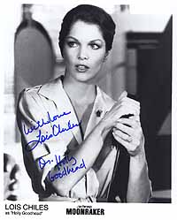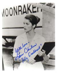 | #4678 Lois Chiles US $ 69.00 Wonderful 8x10 color shot as HOLLY GOODHEAD IN MOONRAKER. Awsome signed in-person by her at the chiller theatre show in April 2002. She added also HOLLY GOODHEAD AND WITH LOVE to her signature. Tough signer!!! |