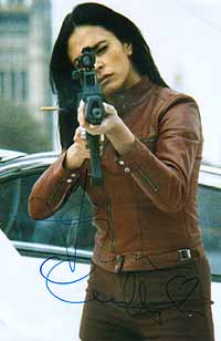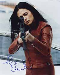 | #2608 Maria Gracia Cucinotta US $ 69.00 8x10 color shot as THE CIGAR GIRL in THE WORLD IS NOT ENOUGH. Wonderful shot from the movie with machine gun. Signed in person at the "THE BEACH" premiere in Los Angeles on Feb. 3 2000 at Mann's Chinese theater. She is a tough signer and hard to get!!!! |