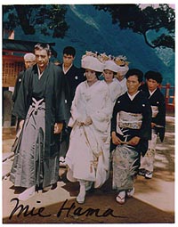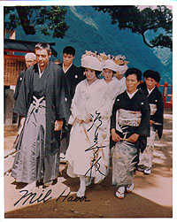 | #3564 Mie Hama US $ 399.00 9x12 color shot from her WEDDING with 007 in YOU ONLY LIVE TWICE. Gotten from a german collector who got her directly from Japan. Wonderfully signed in black! She is one of the most sought after 007 signatures!!!! |