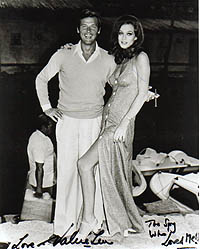 | #2450 Valerie Leon US $ 79.00 8x10 color shot as the sexy deep see fishing enthusiast who "hooks" Bond. Pictured with Sean Connery in bed!!!!. She added Best Wishes to her singature. VERY RARE!!! All trough the mails are secretarials!!! Get a rare good one. |