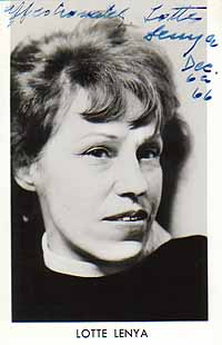| #3546 Lotte Lenya (dec.) US $ 699.00 WHAT A CHANCE!!! Signed 4x6 photograph from Lotte Lenya aka ROSA KLEBB in FROM RUSSIA WITH LOVE, signed by her in 1966. She is nearly impossible to find on photographs, especially not on such a nice one! Obtained from a top GB source for vintage material. |