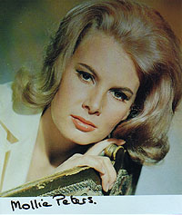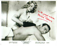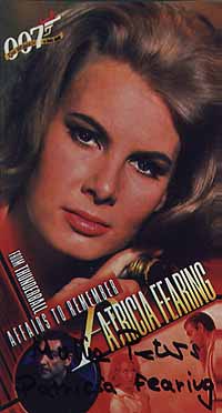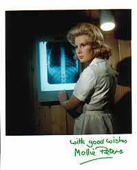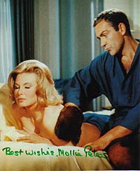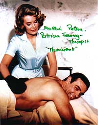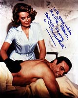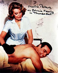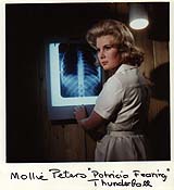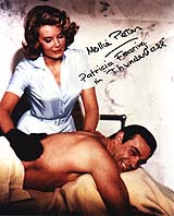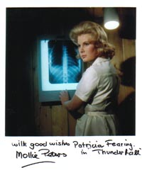 | #2737 Mollie Peters US $ 119.00 8x10 color shot as PATRICIA FEARING-THE THERAPIST IN THUNDERBALL. Incredible rare autograph on a wonderful color shot. SHE ALSO SIGNED WITH HER CHARACTER NAME "PATRICIA FEARING". Obtained directly in April 2000 from her home! A scorcher!!!! |
