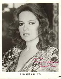 This page is no longer maintained.Please adjust your bookmarks and visit our new homepage! We are pleased to present a WORLD EXCLUSIVE selection of autographs from LUCIANA PALUZZI WHO PLAYED THE ROLE OF FIONA VOLPE IN THUNDERBALL. Luciana signed these autographs directly and officially world-exclusive for B'BC president Alexander G. Brauchle in August 2002. All of the autographs in this section are from this private signing for us. Mrs. Paluzzi signs from now on world exclusive for b'bc by contract. Se we are from now THE OFFICIAL LICENSED SOURCE for Luciana Paluzzi autographs and the world exclusive place to sell her James Bond autographs. We can offer these awsome RARE autographs for wholesale prices. Each autograph comes with a signing photo from Mrs. Paluzzi and our official Luciana Paluzzi COA from b'bc! Buy with confidence from B'BC Each autograph only US $ 69.00 |