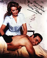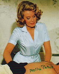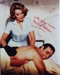 | #5240 Mollie Peters US $ 149.00 Wonderful and rare 6x9 color shot as Patricia Fearing in Thunderball. Awsome signed by Mollie Peters who added also her character name. Obtained from a private collection. She stopped signing years ago. Very tough to find! |