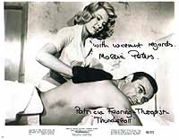 | #2647 Mollie Peters US $ 119.00 8x10 color shot as PATRICIA FEARING-THE THERAPIST IN THUNDERBALL. Incredible rare autograph on a wonderful color shot. This is the famous "fur" scene with Sean Connery aka James Bond. SHE ALSO SIGNED WITH HER CHARACTER NAME "PATRICIA FEARING". Obtained directly in March 2000 from her home! A scorcher!!!! |