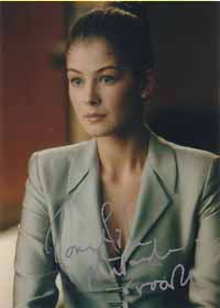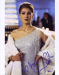 | #5122 Rosamund Pike US $ 149.00 Fantastic 8x10 color shot as MIRANDA FROST in DIE ANOTHER DAY. Awsome signed by her in-person on January 20th, Koma Restaurant, London, UK. She is already now an extremely difficult signer and often refuses to sign even in-person. Trough the mail she stopped totally signing! Get a good non-inscribed one. When she signs she often inscribes. A fantastic piece. |