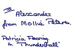 | #2124 Mollie Peters US $ 119.00 8x10 color shot as PATRICIA FEARING-THE THERAPIST IN THUNDERBALL. Incredible rare autograph on a wonderful color shot. This is the famous "fur" scene with Sean Connery aka James Bond. Inscribed. Obtained directly in Nov.1999 from her home! Inscribed to Alexander! |