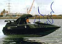 | #4854 Pierce Brosnan US $ 119.00 Very rare 8x10 color shot as 007 James Bond on River Themse in London, THE WORLD IS NOT ENOUGH boat chase. Super signed by him in London GB in-person! |