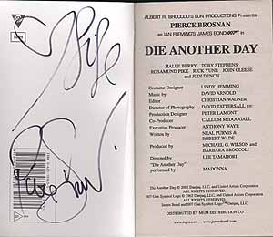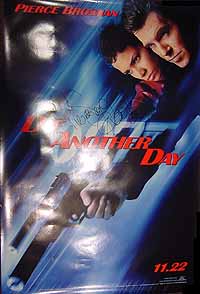 -DIE ANOTHER DAY AUTOGRAPH- BRANDNEW- 8x10 color shot as 007 James Bond in DIE ANOTHER DAY. Wonderfully signed by Pierce Brosnan in-person for us on 11/5/2002 at the TODAY show set, New York City. Very tough to get this meanwhile tough signer on material fromthe brandnew released Bond adventure. |