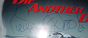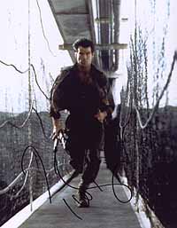 -DIE ANOTHER DAY AUTOGRAPH- BRANDNEW- 8x10 color action shot as 007 James Bond in the DIE ANOTHER DAY pretitle sequence. Wonderfully signed by Pierce Brosnan in-person for us on 11/4/2002 at the "Mark" hotel, New York City. Very tough to get this meanwhile tough signer on material fromthe brandnew released Bond adventure. |