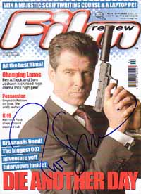 | #5017 Pierce Brosnan US $ 129.00 Brandnew 8x10 color cover page of the brandnew FILM REVIEW magazine. Pictured on the front page as 007 James Bond in his classic Bond pose. This is the classic press shot for DIE ANOTHER DAY. Pierce signed in-person for my star-chaser in October 2002 in New York City at the Mark Hotel and the New School. He was in NYC to promote Die Another Day and the new Omega watch. |