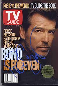 | #5354 Pierce Brosnan US $ 229.00 Fantastic item! Original US TV Guide November 9-15 Time Warner Manhatten edition with 288 pages, signed in-person by Pierce Brosnan aka 007 James Bond himself in Die Another Day while promoting the new James Bond adventure in New York City during November 2002. A one of a kind piece!!! They produced 2 different title pages. This is the one with Pierce Brosnan on it. RAREST!!!! |