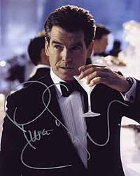 | #5355 Pierce Brosnan US $ 129.00 Fantastic 8x10 color shot as 007 James Bond in DIE ANOTHER DAY. Awsome signed in-person by Pierce Brosnan in London, Feb. 2003 for a top star chaser in London. Wonderful in-person piece on a very rare and classic martine drinking shot from the new film. |