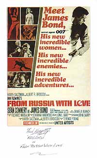 #4771 Fred Haggerty (dec.) US $ 1269.00 -RAREST- 8x10 color shot from FROM RUSSIA WITH LOVE POSTER, signed by Fred Haggerty who portrayed the bulgar assassin "KRILENCU" who has a personal vendetta against Kerim Bey. Incredible rare James Bond autograph!!! Wonderfully signed by him also with his character name and From Russia with love. |