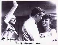 #5091 Alf Joint US $ 229.00 -original 1964 german Goldfinger lobby card- Awsome and rare 8x10 original 1964 lobby card as the asassin CAPUNGO IN GOLDFINGER. Signed by Alf Joint and he added also "as Capungo in Goldfinger 1964" to his signature. Extremely rare to find autograph on a more than rare photo!!! Obtained directly from him in February 2003 |