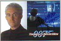 #4983 Jonathan Pryce US $ 69.00 Extremely rare 4x6 color original Tomorrow Never Dies postcard portrait. Wonderfully signed by Jonathan Pryce aka Elliot Carver in TND. Very rare motive. Obtained from a private collection. |