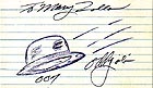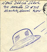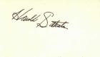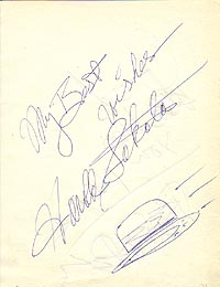#2500 Harold Sakata (dec.) US $ 889.00 4x4 envelope slip, signed by Harold Sakata, ODDJOB in GOLDFINGER. He signed "Harold Oddjob Sakata" and wrote his private address under the signature. Also he stamped his famous hat under the signature and the address. He is extremely rare in any form. Great to matt with a nice Goldfinger Oddjob photo. |