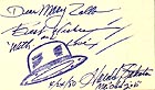 #3118 Harold Sakata (dec.) US $ 1999.00 -signed in 1960's- large vintage 8x10 white album page, signed by Harold Sakata in 1966 over the whole page. He also has drawn his flying at under the signature. Incredible rare one of a kind item. Perfect for matting with a nice picture as ODDJOB in GOLDFINGER. On the backside Bob Dylan has signed also in 1966. Buy a Sakata with 100% confidence for authenticity!!! |