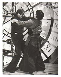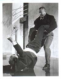 #4893 Harold Sakata (dec.) US $ 1899.00 Vintage 8x10 bw Goldfinger photo, signed by Harold Sakata aka MR ODDJOB in GOLDFINGER. He wonderfully signed this still with his name, character name, 007, and added "Aloha" and also he has drawn his famous flying hat!!! Incredible nice piece! Harold Sakata is today nearly impossible to get on any photos, especially on such a nice example with all these additions. Harold Sakata had this dramatic battle scene specially printed just to mail to fans who requested autographs and when signing them would further festoon each print with huge salutations and symbols. Only a handful of these have surfaced over the years. This is only the second one we ever saw!!! Obtained from a famous +30 year collection. This item was obtained many many years ago directly from Harold. Top provenance. A must to complete your James Bond collection!!! |