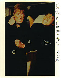 #4567 Telly Savalas (dec.) US $ 299.00 Awsome 8x10 color shot as "Ernst Stavro Blofeld" in ON HER MAJESTY'S SECRET SERVICE. Wonderful shot and awsome signed by Telly Savalas. VERY RARE!!! Telly signed this one in-person in 1991 for a friend of mine in Geneva/Switzerland. Perfect provenance. From my personal collection. |