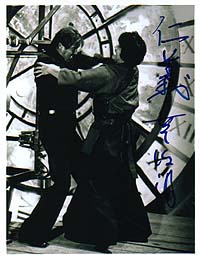 #4500 Harold Sakata (dec.) US $ 1899.00 8x10 bw original vintage 1964 Goldfinger press still, signed by MR ODDJOB in GOLDFINGER. He wonderfully signed this still with his name, character name, and added "Best Wishes" and also he has drawn his famous flying hat!!! Incredible nice piece! Harold Sakata is today nearly impossible to get on any photos, especially on such a nice example with all these additions. Obtained from the top collection of a world famous autograph book author. |