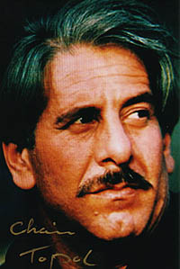 #3197 Chaim Topol US $ 79.00 8x10 bw shot as the Greek Smuggler in FOR YOUR EYES ONLY. Wonderful signature, signed trough the mail for a private german collector. He added also Shalom! |