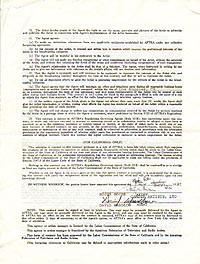 Sean Connery contract/DS US $ 499.- SEAN CONNERY (JAMES BOND): SIGNED CONTRACT/DS--"Billing Guaranty:Sean Connery". This is a 2 page document between INFOREX CORPORATION, N.V. and the "Picture". This contract is BLANK (no movie title or date except for Connery's signature on the 2nd page-very uncommon.) This gives all the scoop on STAR BILLING demands. Here are some samples from the document -"Connery shall be accorded star billing in first position alone above the artwork and reular titles in all paid ads---Connery's billing shall be on a separate line and shall be in a size of type at least twenty-five percent (25%) larger than the size of type used for any other cast member but not less than one hundred percent (100%) of the regular title and not less than twenty-five (25%) of the largest letter of the artwork title----" ---This is a very interesting document. Small staple holes in upper left corner otherwise perfect condition dated 12/11/81 in lower right corner. Could it be a contract piece of "Never say never again"? Same time and also with Inforex........We'll search! |