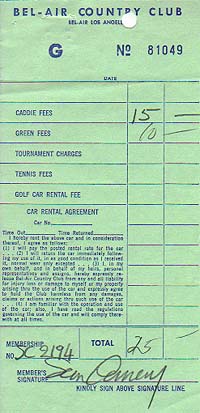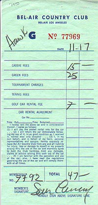 | #3459 Sean Connery US $ 369.00 Bel Air Country Club receipt for Caddie Fees, Golf Car rental and Greenfee on 7/7/92, signed by Mr.James Bond aka Sean Connery himself. Get this rare item and be sure a 1000% to have an authentic Connery. Perfect for matting. He is very rare on any documents. |
