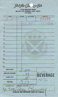| #3716 Sean Connery US $ 399.00 Bel Air Country Club receipt for Food and Beverage, signed by Mr.James Bond aka Sean Connery himself. Get this rare item and be sure a 1000% to have an authentic Connery signature. Perfect for matting. He is very EXTREMELY rare on any documents. These are the last ones we could get. The Bel Air Source is now sold out! |