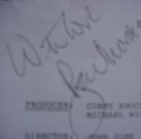 | #1581 Pierce Brosnan US $ 189.00 Tomorrow never dies script (post production copy). Draft 8/23/96 Signed by Pierce Brosnan in Great Britain this year. Signature is very sloppy but a REAL one, what is more important in my opinion!!! One of a kind! |