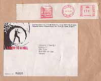 his private property- Personal Envelope addressed to Mr. Desmond Llewelyn FROM EON JAMES BOND PRODUCTION COMPANY. SENT FROM PINEWOOD STUDIOS TO DESMOND IN 1984. BEARS ALSO THE LOGO FROM "A VIEW TO A KILL". A PERSONAL PIECE FROM DESMOND. Perfect for matting! A piece with lots of Bond history!!! |