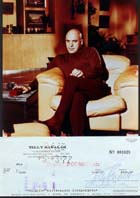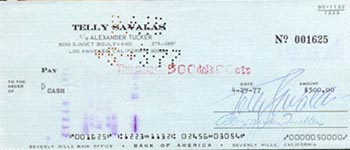 | #3711 Telly Savalas (dec.) US $ 149.00 Original private check of Mr. Savalas. Dated in 1977. Perfect signature. Comes with an 8x10 color photo of Savalas as "BLOFELD" in On her majesty's secret service. Savalas is rare in any authentic material as he used secretarials to sign his fan mail. We have gotten the last checks available on the market. So we have a very limited quantitiy. Order fast!!!! |