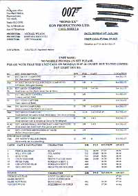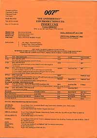 | #prop226 DIE ANOTHER DAY US $ 99.00 Original production used CALLSHEET for the filming of the brandnew 007 adventure DIE ANOTHER DAY. Different pages loaded with backround information for plot and production of the new James Bond adventure. These callsheets are extremely rare to come by. Used by crew member of the film. |