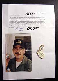 | #prop277 DIE ANOTHER DAY US $ PLEASE MAKE OFFERS (Estimate Value 3899.00 US $ ) AWSOME ITEM FOR EACH JAMES BOND FAN AND WATCH COLLECTOR. We got hold of the small Omega tag with serial number which was taken from the Pierce Brosnan used Omega in the new movie. We pictured the side with serial number very small to keep any fakes away from the market. Mr. Howard has taken off the small withe Omega tag with serial number xxxxxxxx off the 18k solid Gold Omega watch, utilised by Pierce Brosnan in the filming of DIE ANOTHER DAY. The watch in question had to have its 18k gold solit strap removed so that a leather strap could be affixed. There is also a photograph enclosed of this watch being held whilst at the Studio at Pinewood, just prior to the strap being affixed. The photograph is signed and dated and also the watch tag number is on it. Also it comes with a detailed letter of authenticity from Mr. Howard. When you own this tag you can phone Omega and they tell you it is from THE REAL BOND WATCH, as this serial number is registered with them as used in the Bond production!!! Awsome piece for framing! |