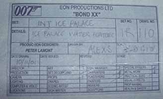 | #prop 305 DIE ANOTHER DAY US $ PLEASE MAKE OFFERS (Estimate Value 900.00 US $ ) Original interior blue prints for the Ice Palace from the film, Die Another Day. Schematics measure 52 x 33 inches (really big!!!) and give detailed drawings and notations regarding design and construction. In very good condition, with some separation along folds, some small edge tears and light overall wrinkling. Rolled. Original production used blueprint. NO copy!!! |
