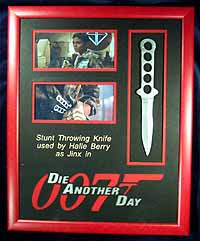The rubber stunt throwing knife used by Halle Berry in the Pierce Brosnan Bond Movie Die Another Day. The knife can be seen towards the end of the movie aboard the plane as Jinx finishes off the treacherous Miranda Frost. This weapon is made from rubber so that no harm would come to the actresses during filming. It has been framed with two photos of the knife being used and a laser cut mount board featuring the movie logo. The display measures 42 x 34 cm (16" x 13"). AWSOME MAJOR PROP FROM THE NEWEST 007 ADVENTURE!!!
