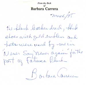#prop212 NEVER SAY NEVER AGAIN US $ PLEASE MAKE OFFERS (Estimate Value 1800 US $) Terrific nice large hat (about 40 cm in diameters), worn by Barbara Carrera in NEVER SAY NEVER AGAIN in her role as Fatima Blush. This is the last piece we could get from her collection. This items comes also with her handwritten letter of provenance!!!!!!!!