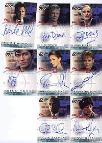 | #5194 DIE ANOTHER DAY $ 1499.00 A ONE OF A KIND COLLECTION!!! We were able to aquire the complete DIE ANOTHER DAY Rittenhouse trading card set. All 8 originally autographed cards from the series. Especially the John Cleese signed card is impossible to find and did cost when released already 150 GBP as it was so limited. You cannot purchase this autograph collection normally. You only can purchase DAD trading card packs and each pack has one signed card in. But you never know which card is in. So it is nearly impossible to complete this signed collection. A true investment piece!!! All of these cards were signed officially for Rittenhouse by the stars. Signed by: Michael Madsen, Judi Dench, John Cleese, Rick Yune, Rosamund Pike, Samantha Bond, Colin Salmon and Kenneth Tsang! |