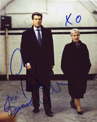 | #5377 DIE ANOTHER DAY US $ 289.00 Our London Star Chaser did it once more: Extremeley rare 8x10 color shot from 007 and M in DIE ANOTHER DAY (SUBWAY SEQUENCE). Awsome signed by Pierce Brosnan in-person while promoting EVELING at the Mandarin Hotel, London, UK. He added "xo" to his signature and who the hell knows why and what does it mean??? Judi Dench signed at the National Theatre in April 2003. She took part in talks against war in Iraq! What a history! Aperfect frontpiece from the new film. |