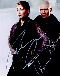 | #5515 DIE ANOTHER DAY US $ 269.00 Awsome 8x10 color shot from DIE ANOTHER DAY. WONDERFULYL DOUBLE SIGNED IN-PERSON BY ROSAMUND PIKE AKA MIRANDA FROST (on Royal Court Theatre "Blond" Party Swan SQ Run 2003) AND ALSO SIGNED BY TOUGH SIGNER TOBY STEPHENS AKA GUSTAV GRAVES (in-person at Savoy Hotel on Feb. 2003). A wonderful and rare signature combination from the last 007 adventure. |
