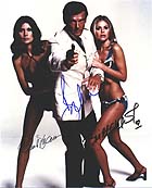 | #1799 MAN WITH THE GOLDEN GUN US $ 299.00 8x10 bw original movie still from THE MAN WITH THE GOLDEN GUN. Signed by 3!!!!! : Roger Moore, Britt Ekland and Maud Adams. Incredible item. Britt's signature is a little rushed but this does not affect this super rare piece. This is quite normal when RELLY three people sign one piece. Take the chance to get this display piece. |